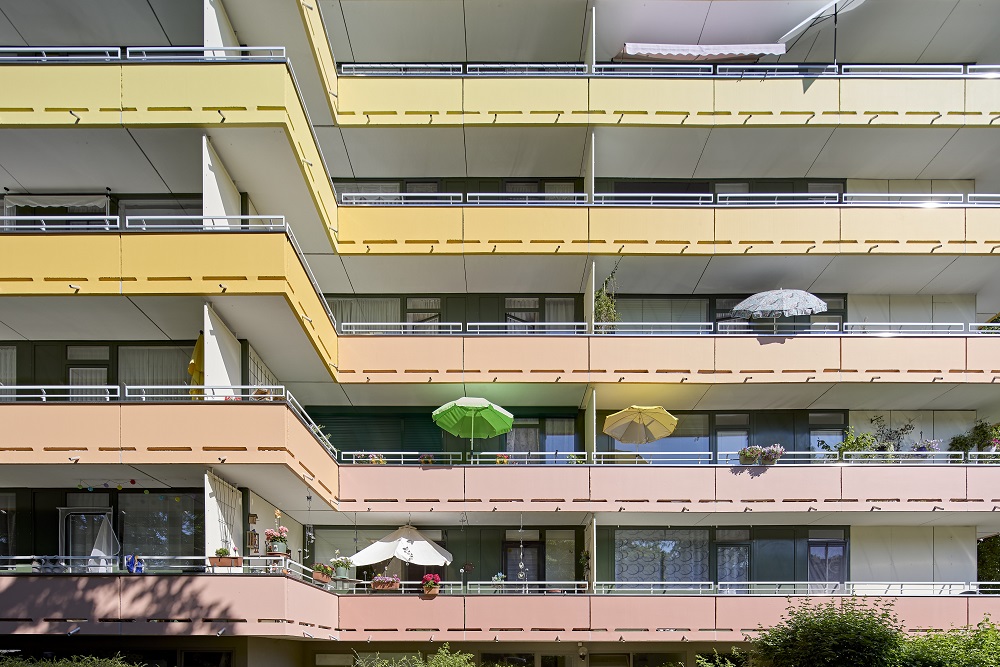 Die langgestreckten Mehrfamilienhäuser in Bergisch Gladbach wirkten vor der Sanierung eher monoton: Der in die Jahre gekommene ockerfarbene Anstrich zeigte einen technischen, spröden Look. Mit der nötigen Betonsanierung ergab sich die Chance, nicht nur die Substanz, sondern auch die Ausstrahlung zu verbessern. Die Lösung: ein kraftvoller Farbverlauf, der Leichtigkeit und Wärme ins Spiel bringt.